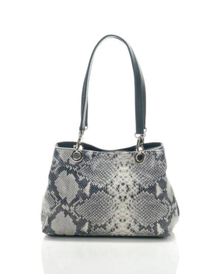 Genuine leather bag, python print. Made in Italy Long handles. Inside: 3 compartments, 1 opening with zip, and 1 with magnetic button.